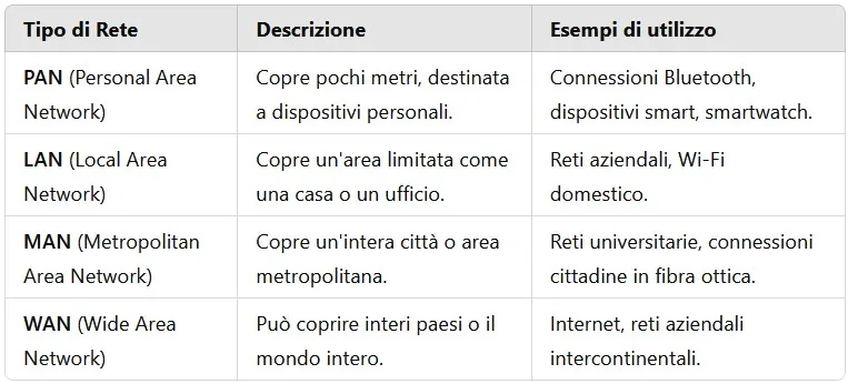 Le reti informatiche si distinguono in base alla loro copertura geografica. Di seguito, una panoramica delle principali categorie: