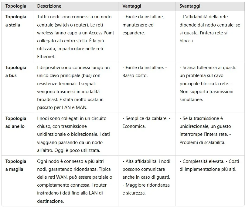 La topologia di rete indica il modo in cui i nodi (computer, router, dispositivi) sono collegati tra loro e come comunicano. Le principali topologie sono: