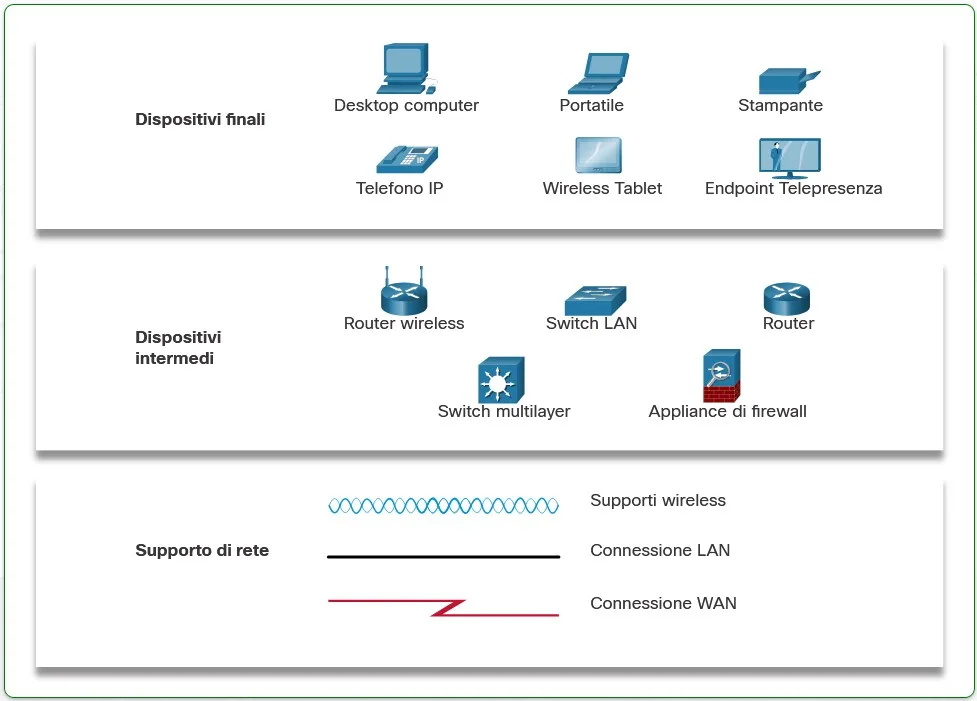 Quando pensiamo a una rete, possiamo immaginare una rete domestica o scolastica connessa ad altri dispositivi come computer, stampanti o smartphone. Ogni dispositivo che si connette direttamente alla rete è classificato come host. Gli host sono dispositivi finali, ovvero dispositivi connessi alla rete che partecipano alla comunicazione di rete. In alcuni casi, gli host vengono chiamati anche client.