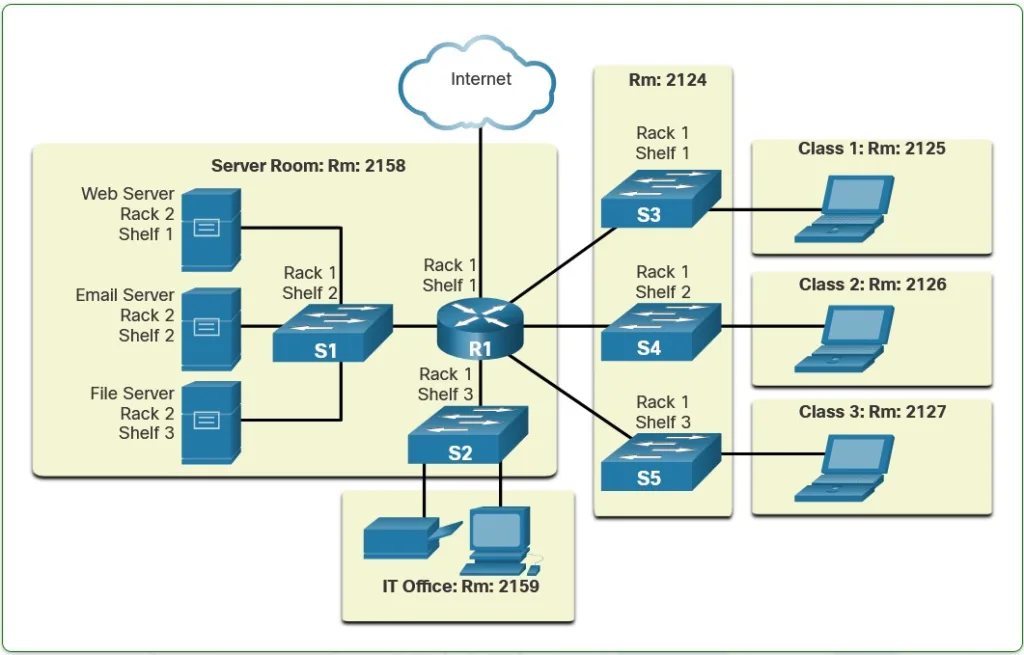 I diagrammi di topologia fisica illustrano la posizione fisica dei dispositivi intermedi e l’installazione dei cavi, come mostrato nella figura. È possibile vedere che le stanze in cui si trovano questi dispositivi sono etichettate in questa topologia fisica.