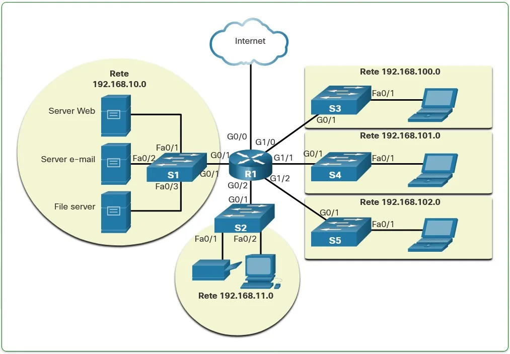 Un diagramma ci aiuta a capire in modo semplice come i dispositivi si connettono in una rete di grandi dimensioni. Questo tipo di “immagine” di una rete è noto come diagramma topologico. La capacità di riconoscere le rappresentazioni logiche dei componenti di rete fisica è fondamentale per poter visualizzare l’organizzazione e il funzionamento di una rete.