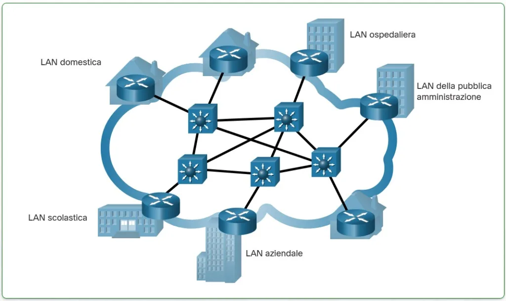 Internet è una raccolta mondiale di reti interconnesse (internetwork o internet in breve). La figura mostra un modo per visualizzare internet come una raccolta di LAN e WAN interconnesse.