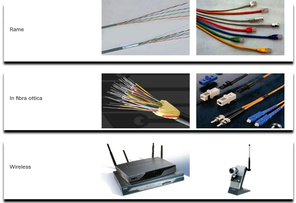 - Mezzi fisici di trasmissione: Questi sono essenziali per il trasferimento dei dati tra i dispositivi. La loro funzione è paragonabile agli “stradoni” che connettono diverse aree e consentono il passaggio di “informazioni” (in questo caso, segnali). I principali mezzi fisici includono cavi di rame, fibra ottica e onde radio (tramite etere).