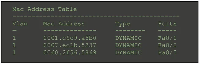 - se l’indirizzo non è presente nella tabella, viene aggiunto insieme al numero di porta dello switch. Ad esempio, nella tabella MAC mostrata nella Figura 1, viene aggiunta la prima riga, che associa all’indirizzo MAC 0001.c9c9.a5b0 la porta Fa0/1, da cui proviene la trama;