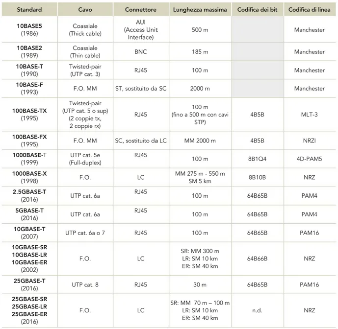 Sono riportati solo gli standard più utilizzati per tipologia; per esempio, per le reti Ethernet a 10 Gbps in fibra ottica, sono stati definiti una decina di standard differenti, ma nella tabella non sono stati inseriti tutti. Infine, se l’informazione non è
