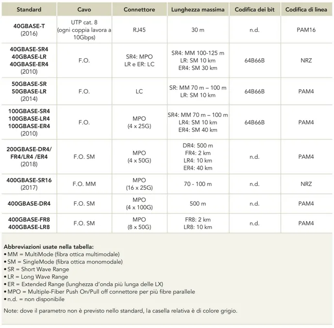 sulle F.O. è indicata come “distanza”. Le distanze massime per le fibre ottiche variano in base al diametro del core; inoltre, è prevista anche una lunghezza minima, non indicata in tabella, che negli standard fino a 10 Gbps è 2 m, per poi scendere a 0,5 m per gli standard con velocità maggiori; - codifica dei bit, come visto nel paragrafo precedente a partire dagli standard a