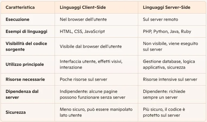 Esempi di tecnologie client-side includono HTML, CSS e JavaScript. Il codice sorgente è visibile all’utente e viene eseguito localmente, consentendo un’interazione immediata senza ulteriori elaborazioni server.