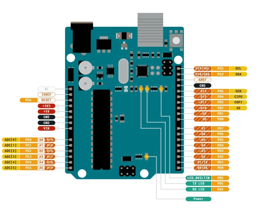 | Ingressi/Uscite | • 14 pin di ingresso/uscita digitali (di cui 6 utilizzabili come uscite PWM) • 6 ingressi analogici • Porta USB utilizzata per la comunicazione con il computer per la scrittura e il debug |