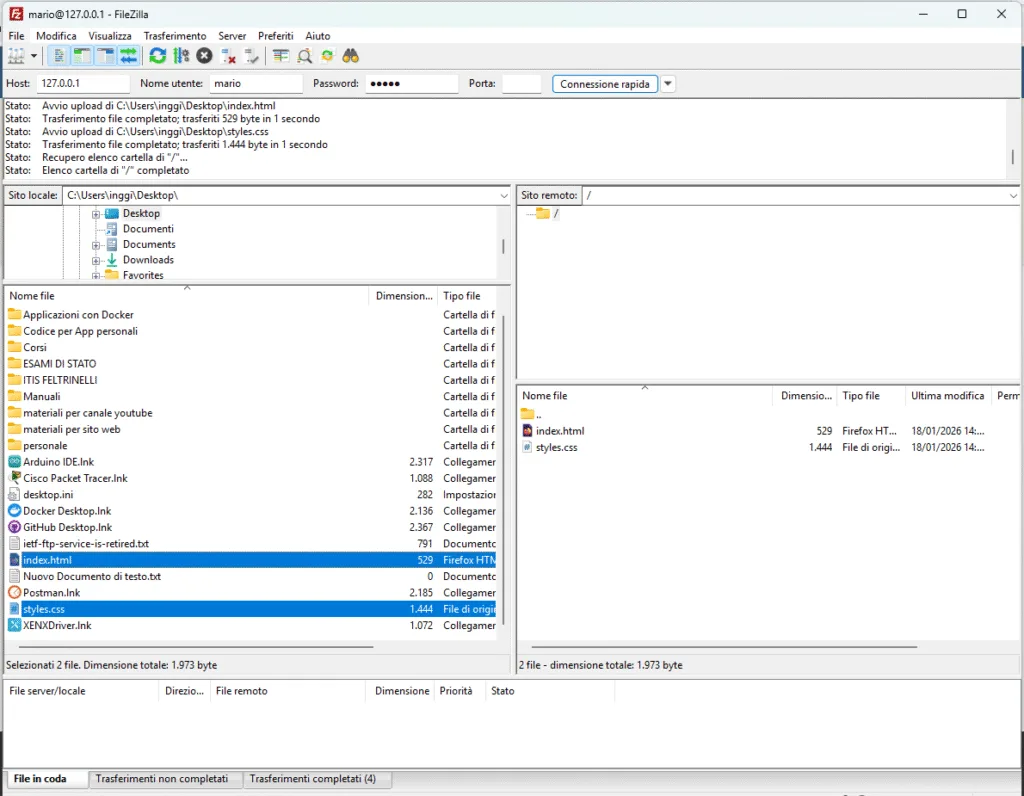 - Per caricare un file: trascinare un file dalla finestra Local site a Remote site